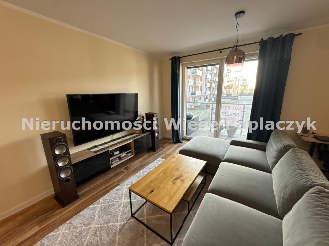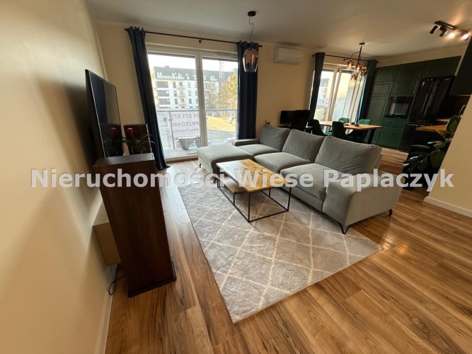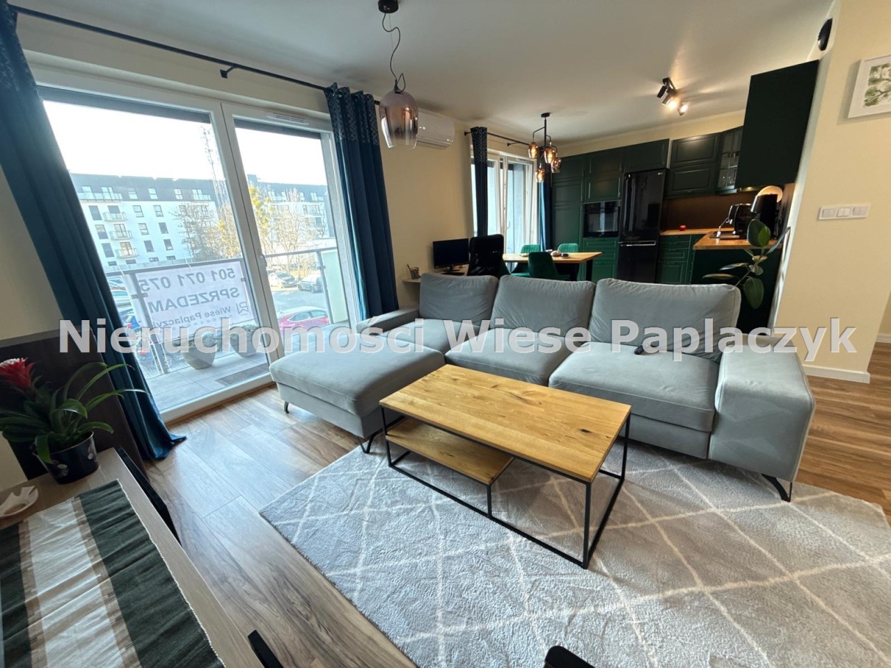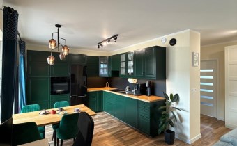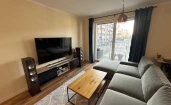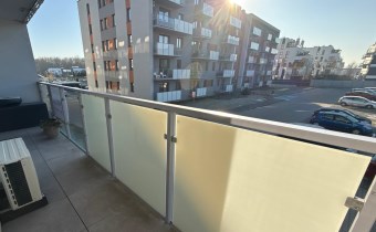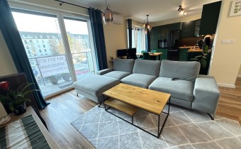 - Przemyślanym rozkładem: przestronny, jasny salon połączony z nowoczesną, otwartą kuchnią, z którego prowadzą dwa wyjścia na duży balkon